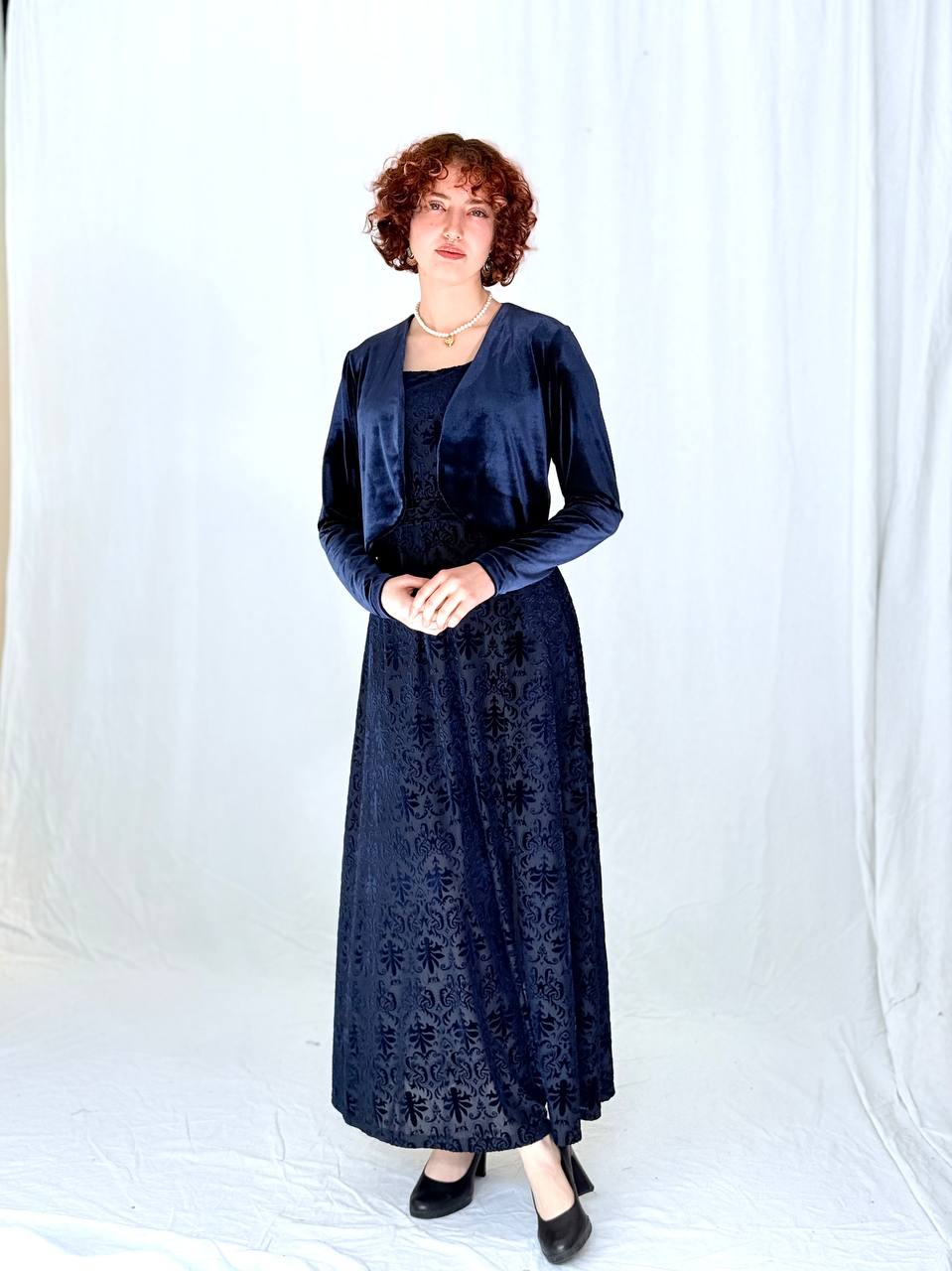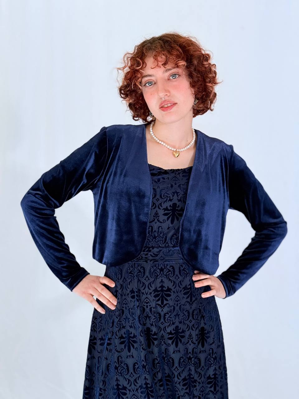 בולרו קטיפה בגזרה נקייה ומחמיאה, עם מפתח פתוח ושרוולים ארוכים.