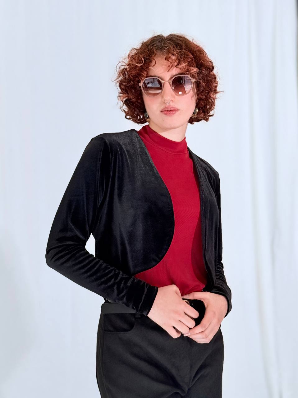 בולרו קטיפה בגזרה נקייה ומחמיאה, עם מפתח פתוח ושרוולים ארוכים.