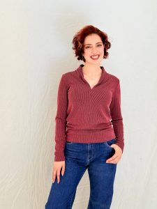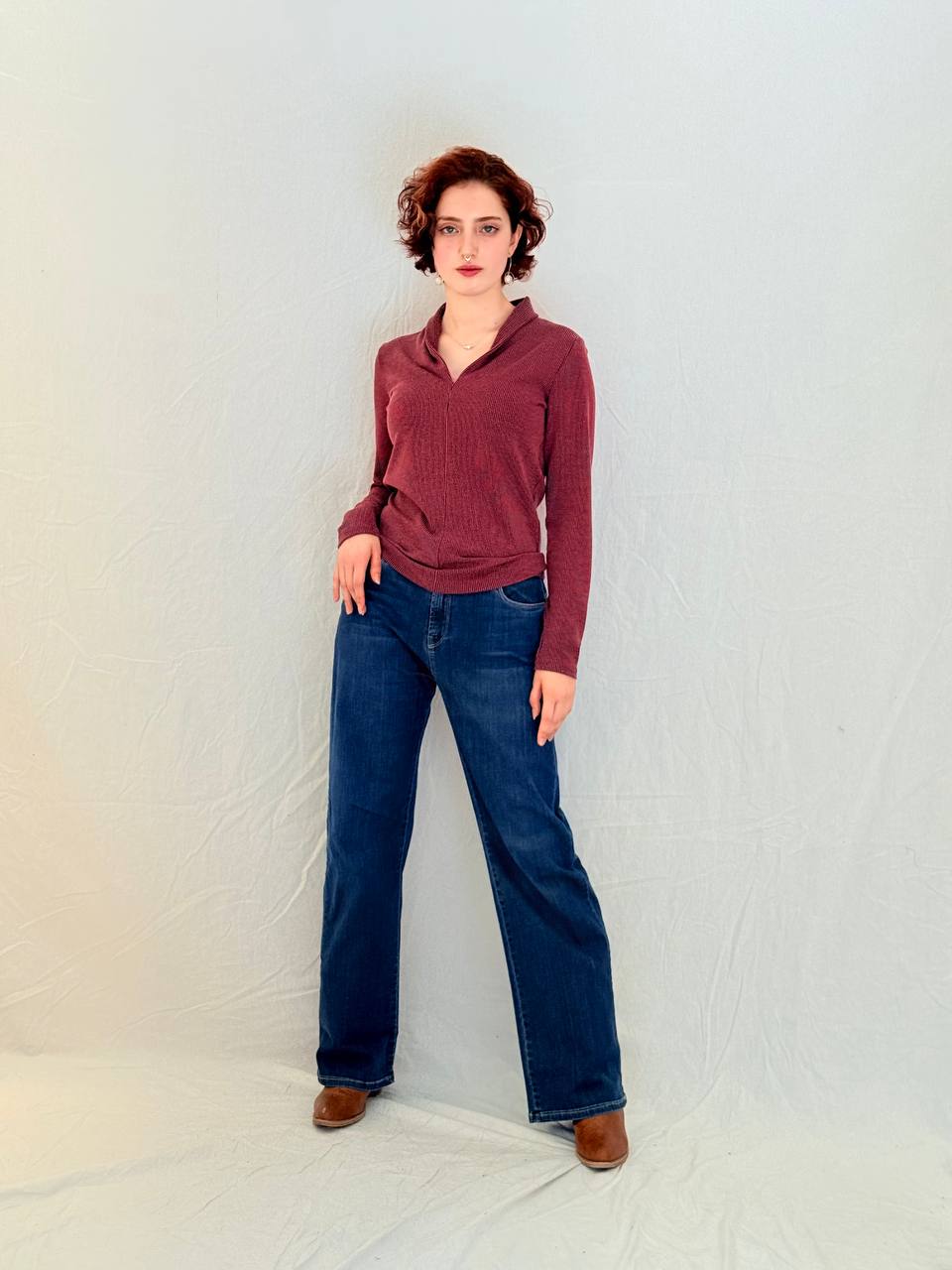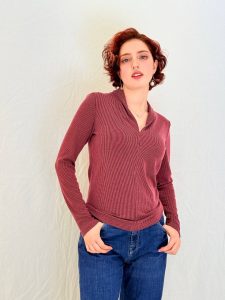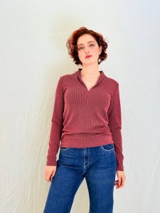 חולצת ריב רכה ונושמת מבד טבעי, עם מפתח V וצווארון קטן שמוסיף אלגנטיות עדינה.