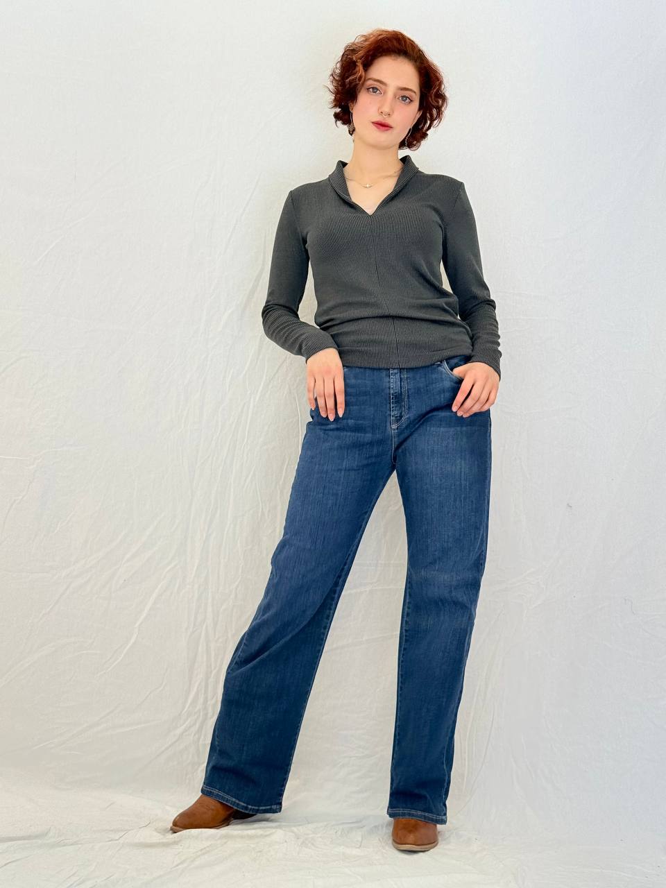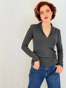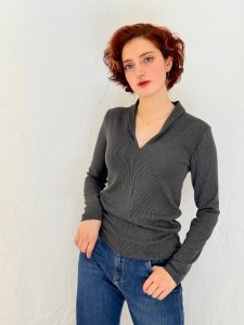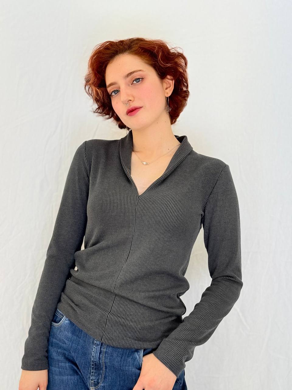 חולצת ריב רכה ונושמת מבד טבעי, עם מפתח V וצווארון קטן שמוסיף אלגנטיות עדינה.