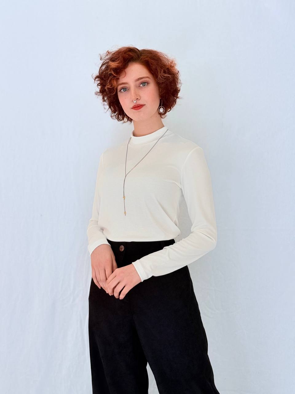 חולצת בייסיק רכה ונעימה, עם צווארון סירה אלגנטי שמחמיא לקו הצוואר ויוצר מראה נקי וקליל.