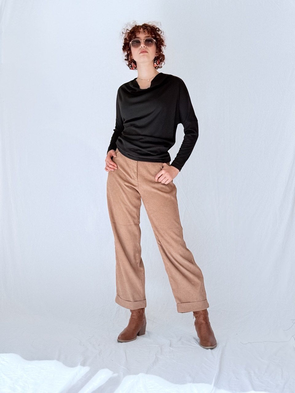 מקורדרוי רך ונעים, בגזרה גבוהה ורחבה שמחמיאה לכל מבנה גוף.