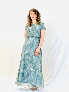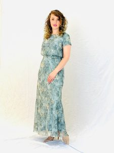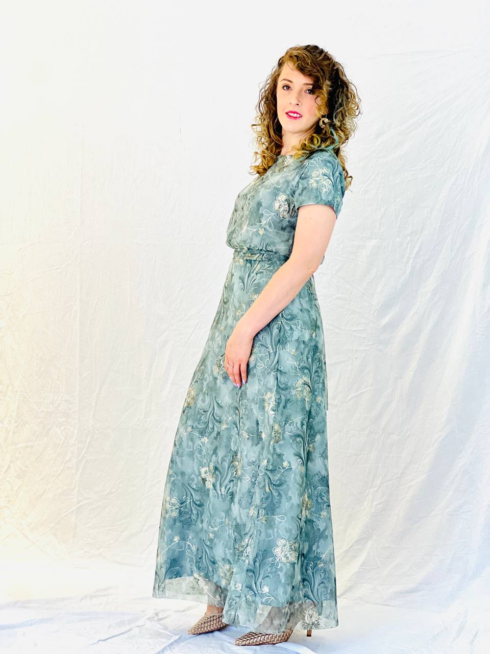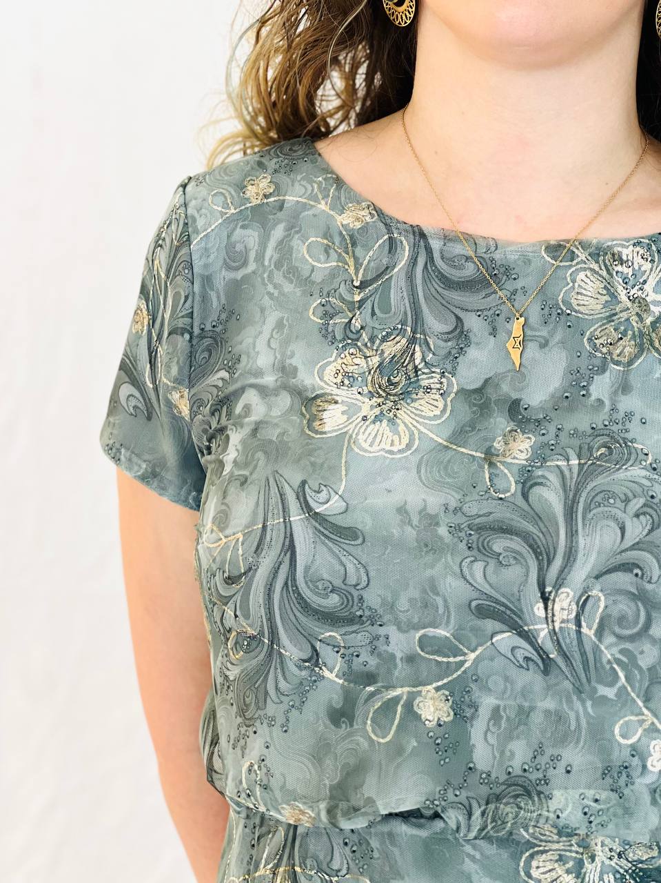שמלת מקסי בהדפס אמנותי שמלה זורמת ומחמיאה, בגזרת מקסי קלילה עם שרוול קצר ומותן מודגשת.