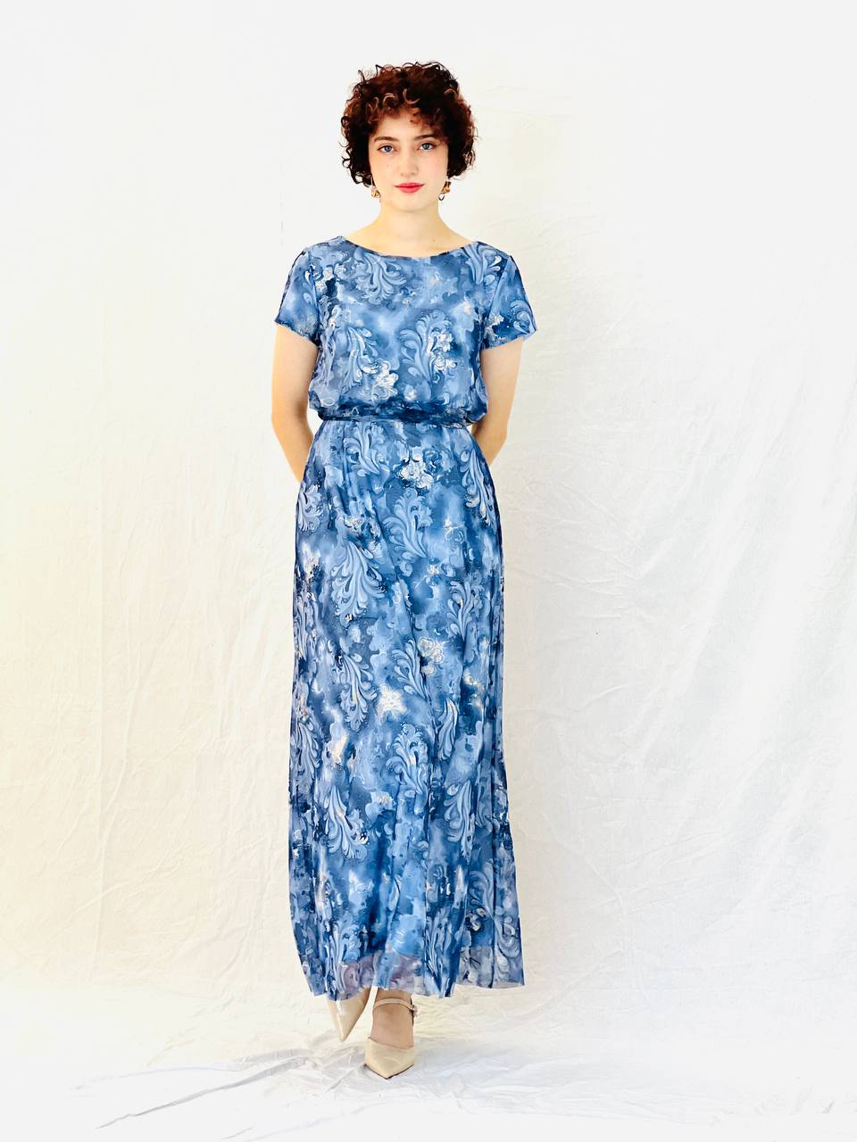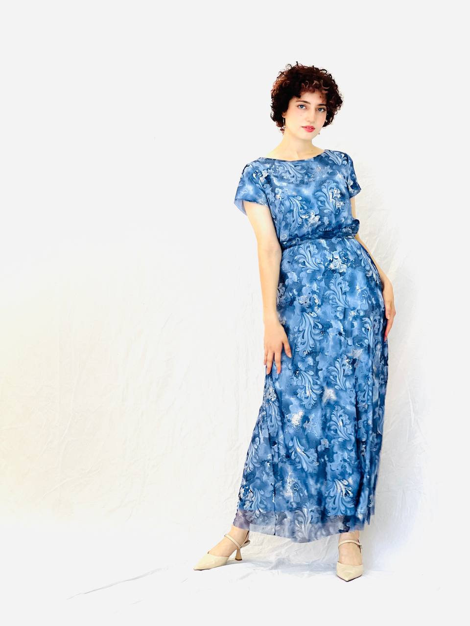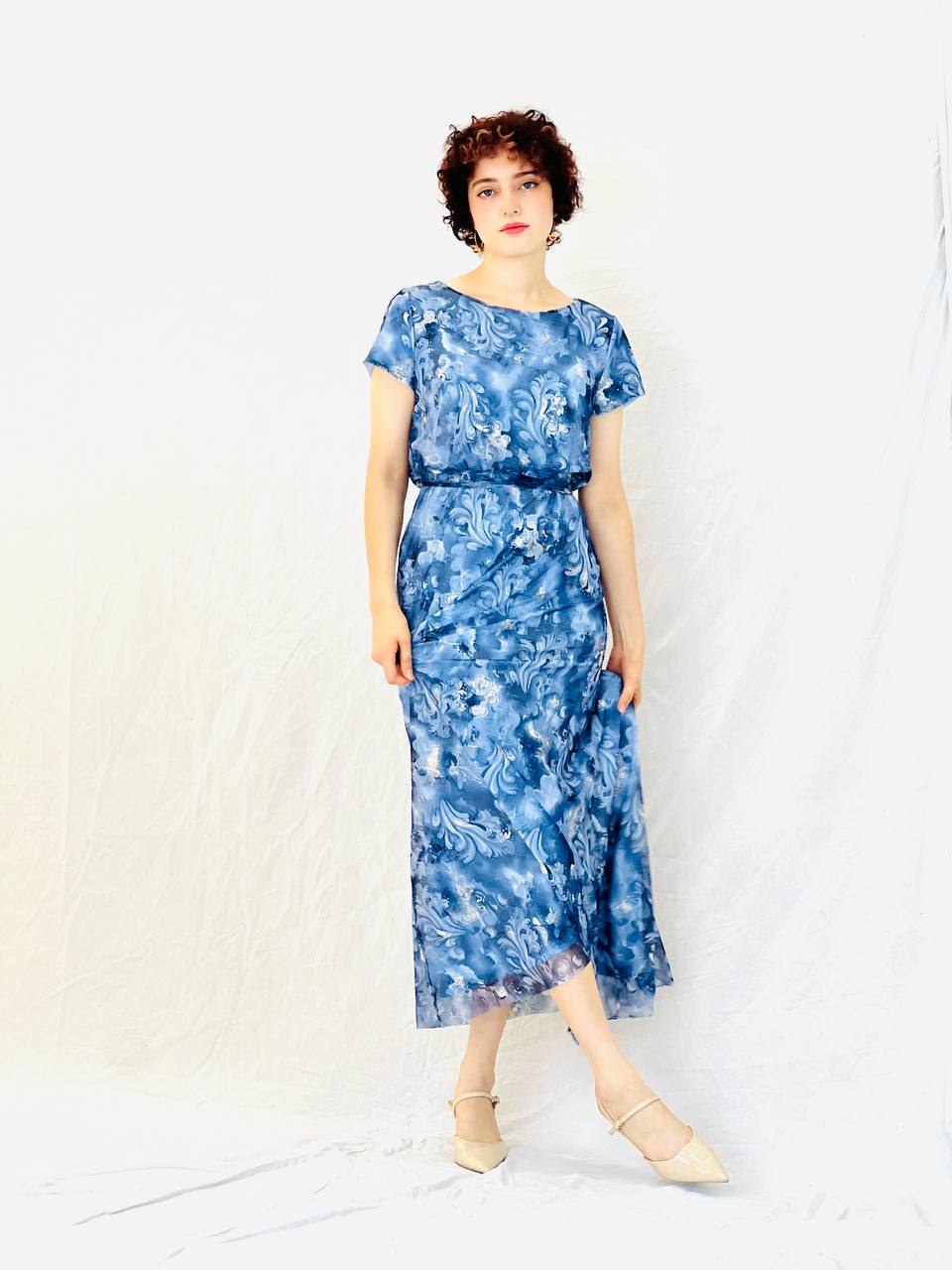 שמלת מקסי בהדפס אמנותי שמלה זורמת ומחמיאה, בגזרת מקסי קלילה עם שרוול קצר ומותן מודגשת.