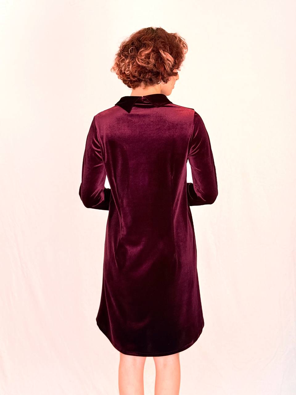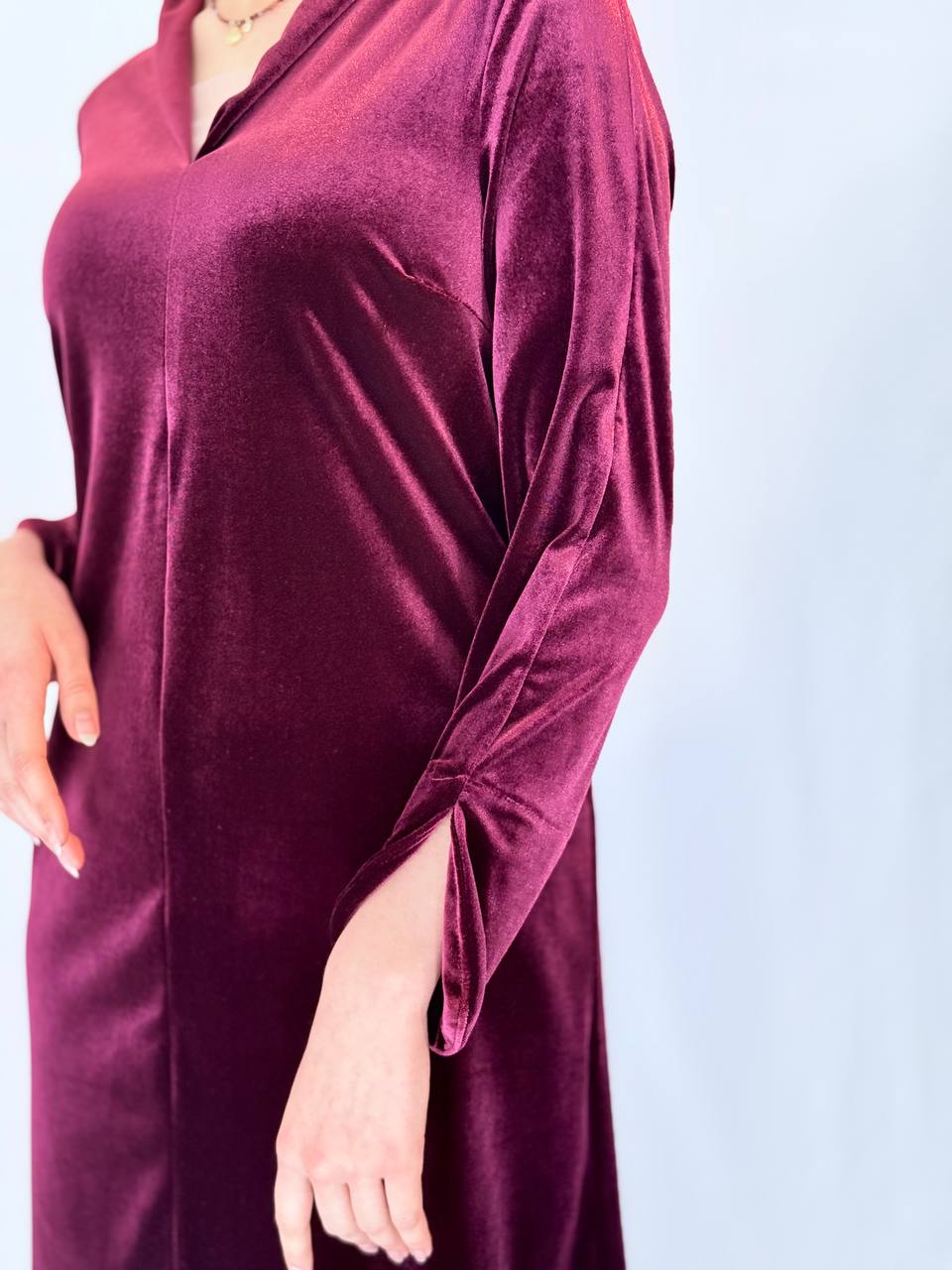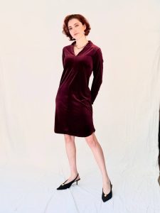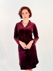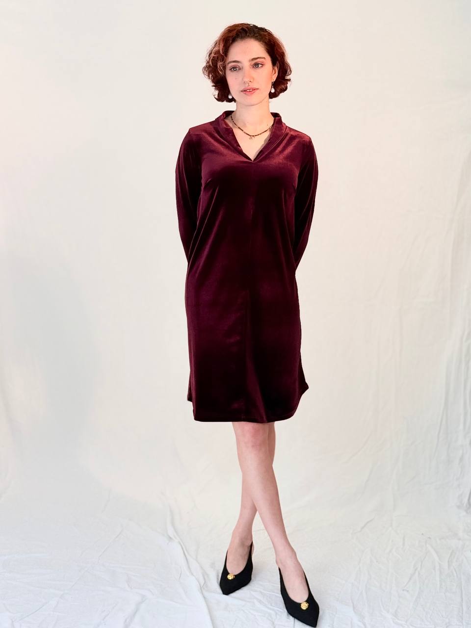 שמלת קטיפה רכה ונשית, עם מפתח V מחמיא ושרוול ארוך.