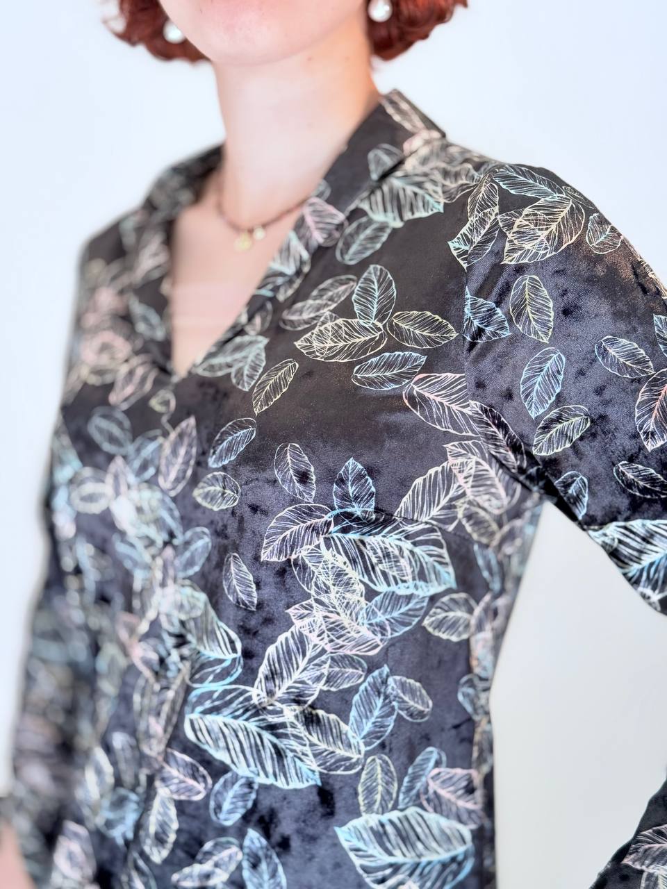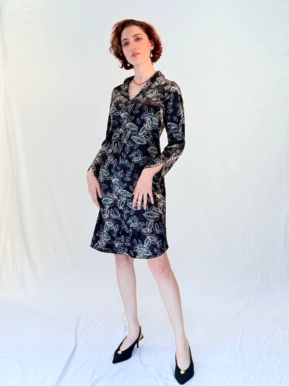 שמלת קטיפה רכה ונשית, עם מפתח V מחמיא ושרוול ארוך.