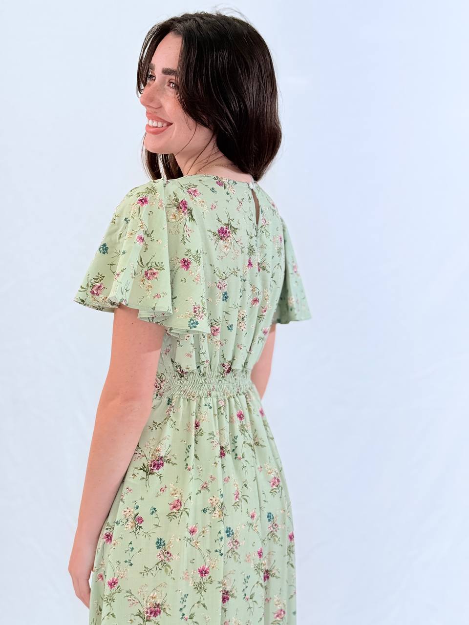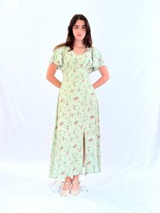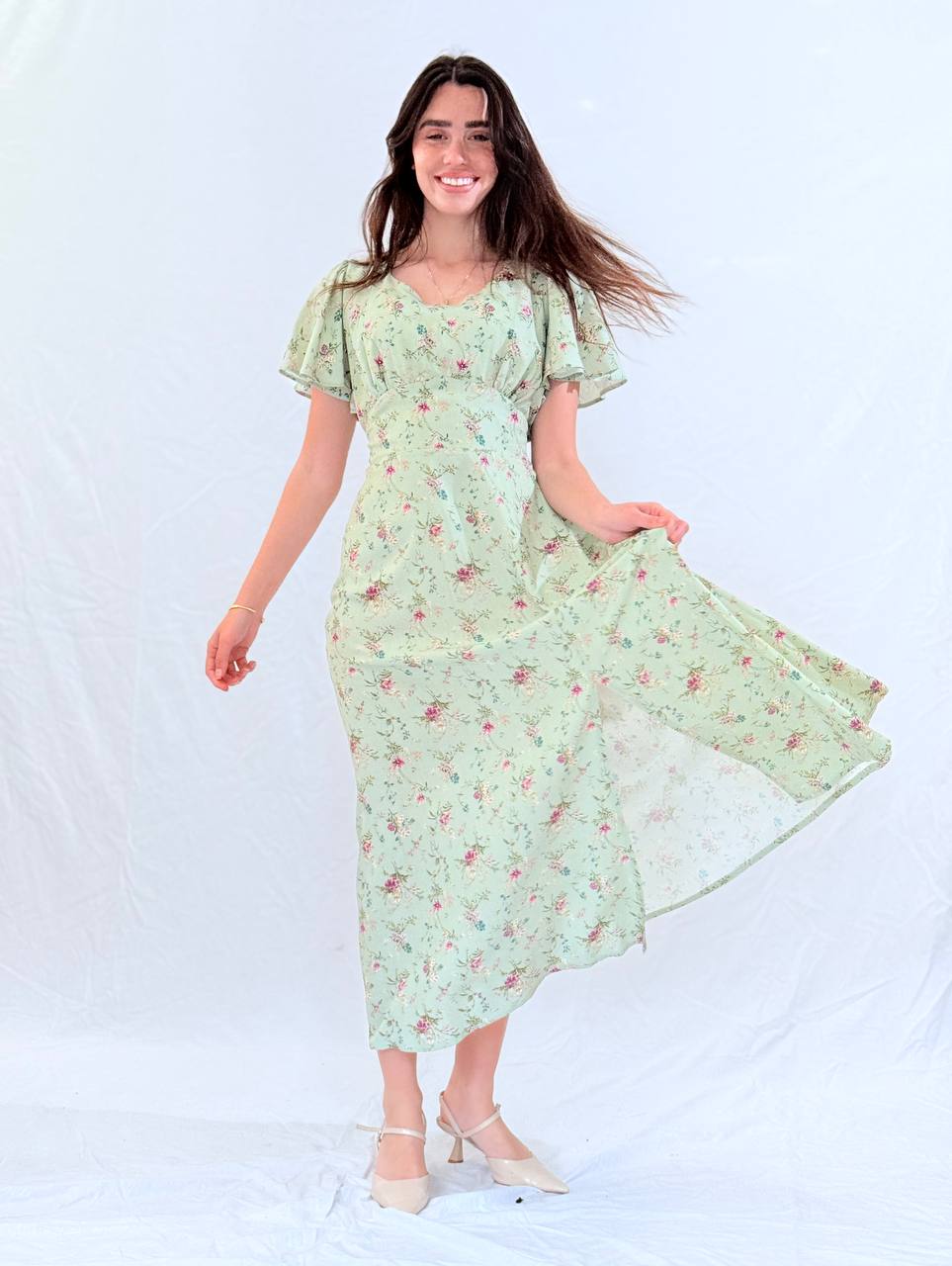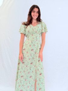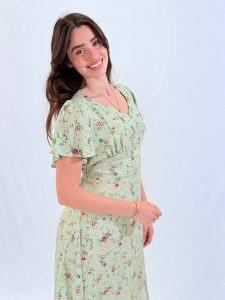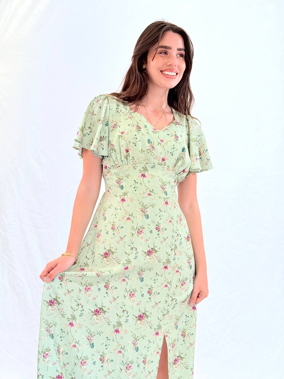שמלת מידי עם צווארון לב שמלה רומנטית וקלילה מבד ויסקוזה נושם, עם שרוולי פרפר ושסע קדמי לתנועה מחמיאה. מתאימה לנערות ונשים עם טעם צעיר ורומנטי.