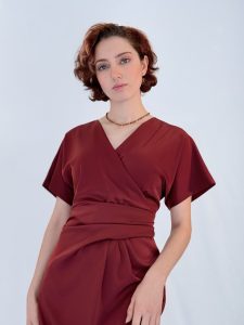 חגורה במותן יוצרת פרופורציות מחמיאות ומשדרגת את הצללית הנשית, בעוד הגזרה המוארכת והשרוול הקצר מוסיפים טאצ’ קלאסי עם ניחוח אירופאי.