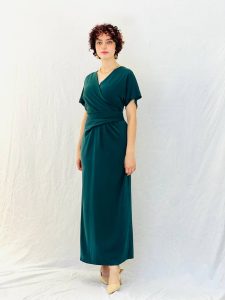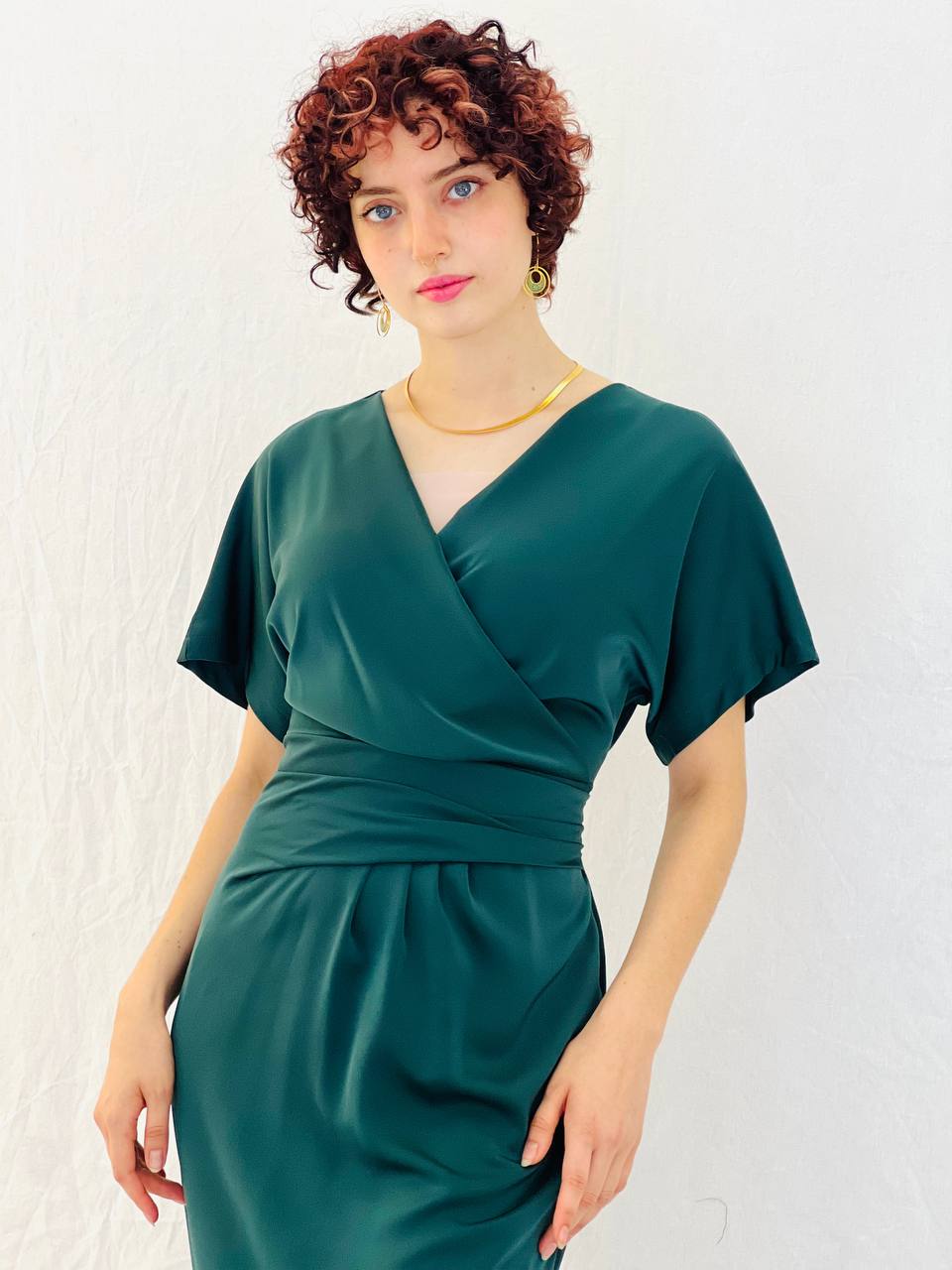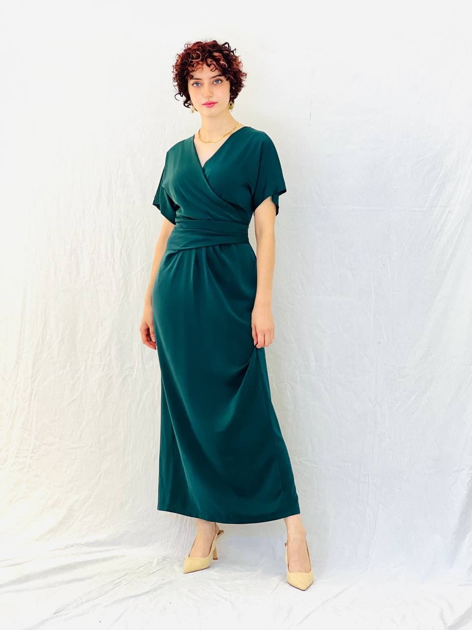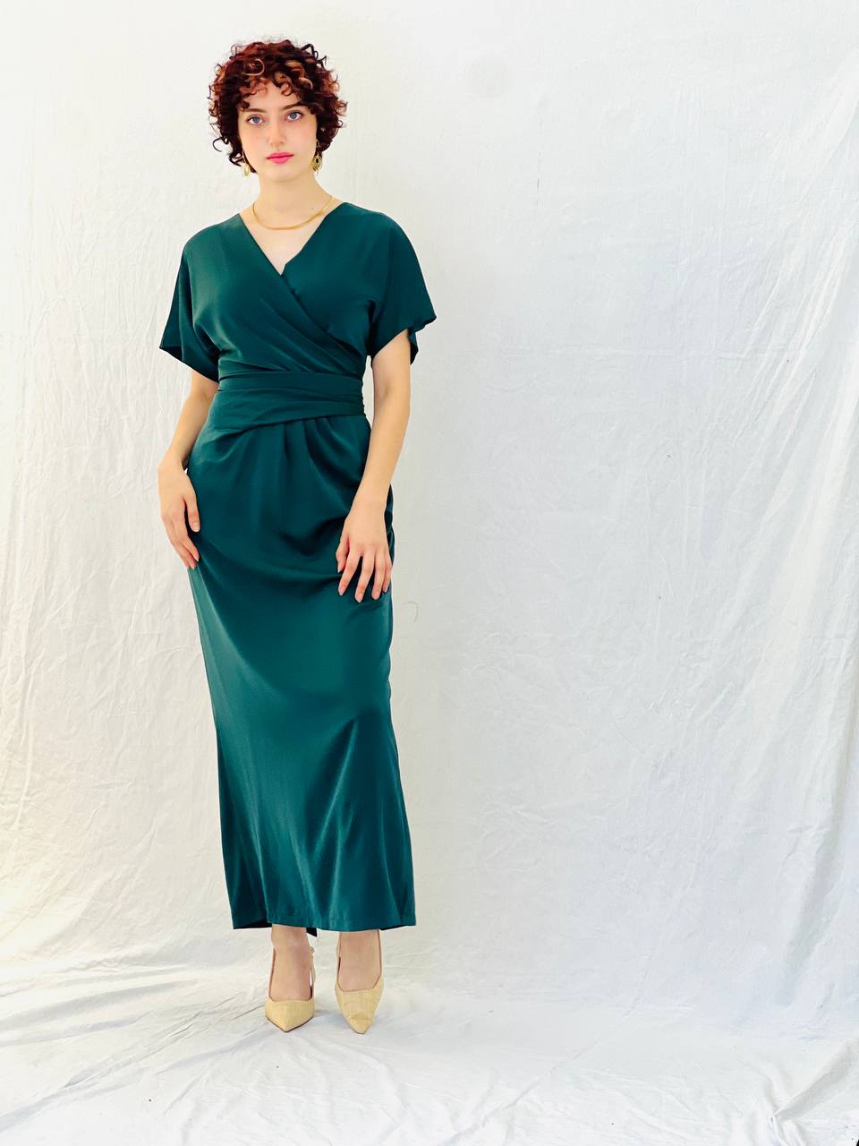 שמלת מעטפת ארוכה בקווים נקיים ומעודנים, עשויה בד סטאן רך ונשפך המעניק מראה אלגנטי ובלתי מתאמץ.