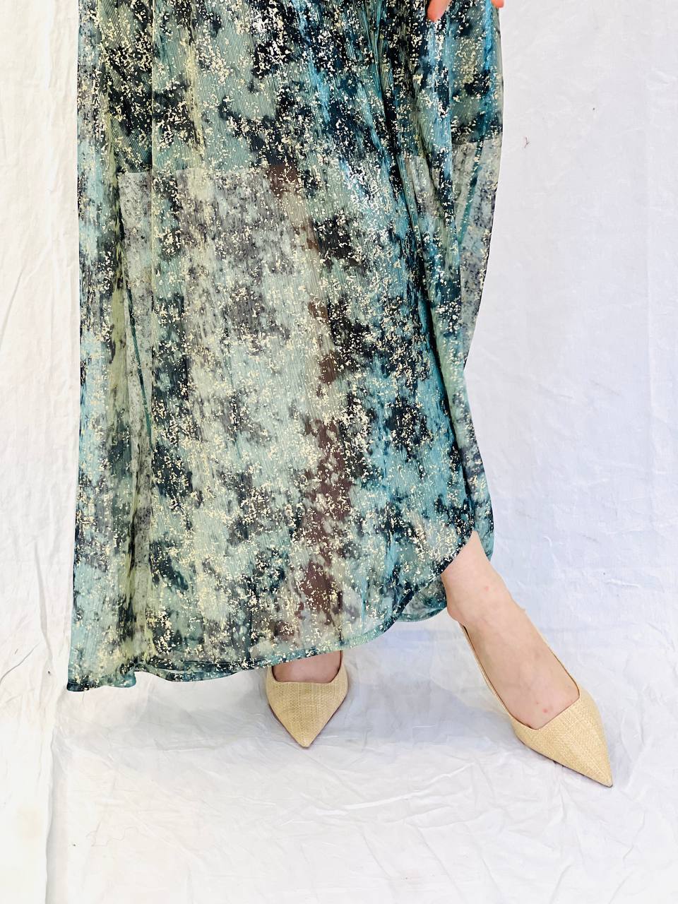 שמלה מבד פליסה נוצץ, שרוול שקוף, פתח וי.