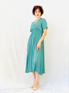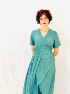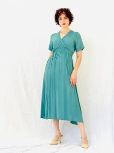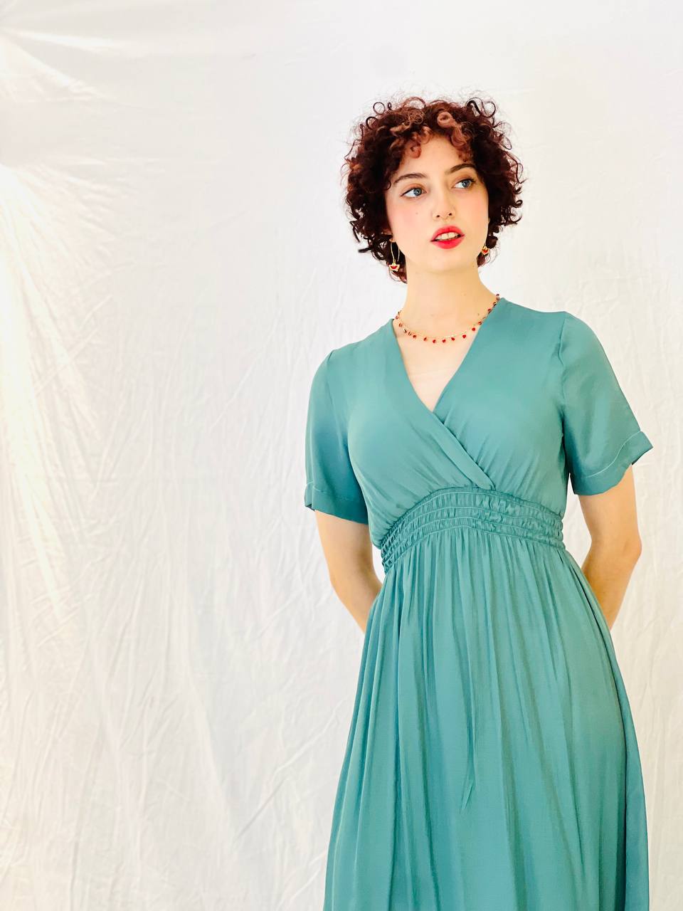 שמלת מקסי קלאסית עם מפתח צוואר V ומותן מכווץ, היוצרת צללית נשית ומחמיאה. מושלמת למראה אלגנטי ונינוח כאחד.