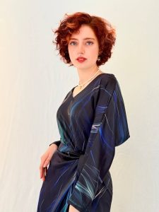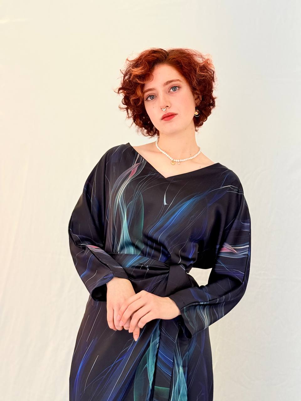 בד סאטן רך ונשפך יושב קרוב לגוף מבלי להצמד, עם ברק עדין שמוסיף עומק ואלגנטיות.