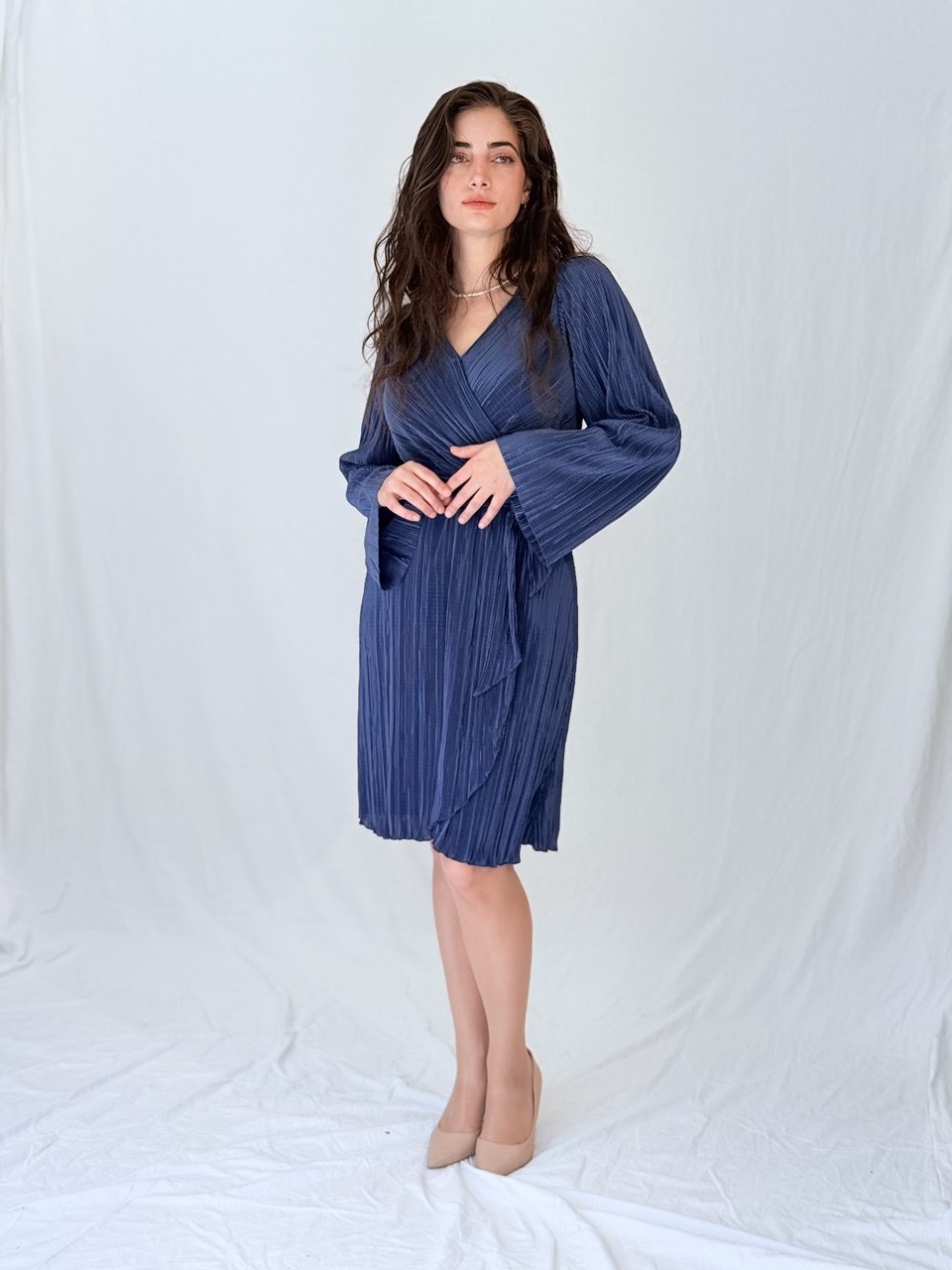 שמלת פליסה בגזרת מעטפת מחמיאה, באורך מידי, עם חיתוך במותן להדגשה מושלמת של הגזרה הנשית.