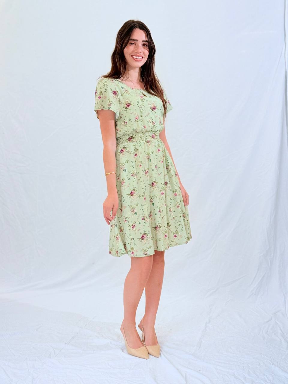 שמלת מידי רומנטית בגזרה מחמיאה עם כיווץ במותן, לנערות ונשים.