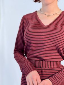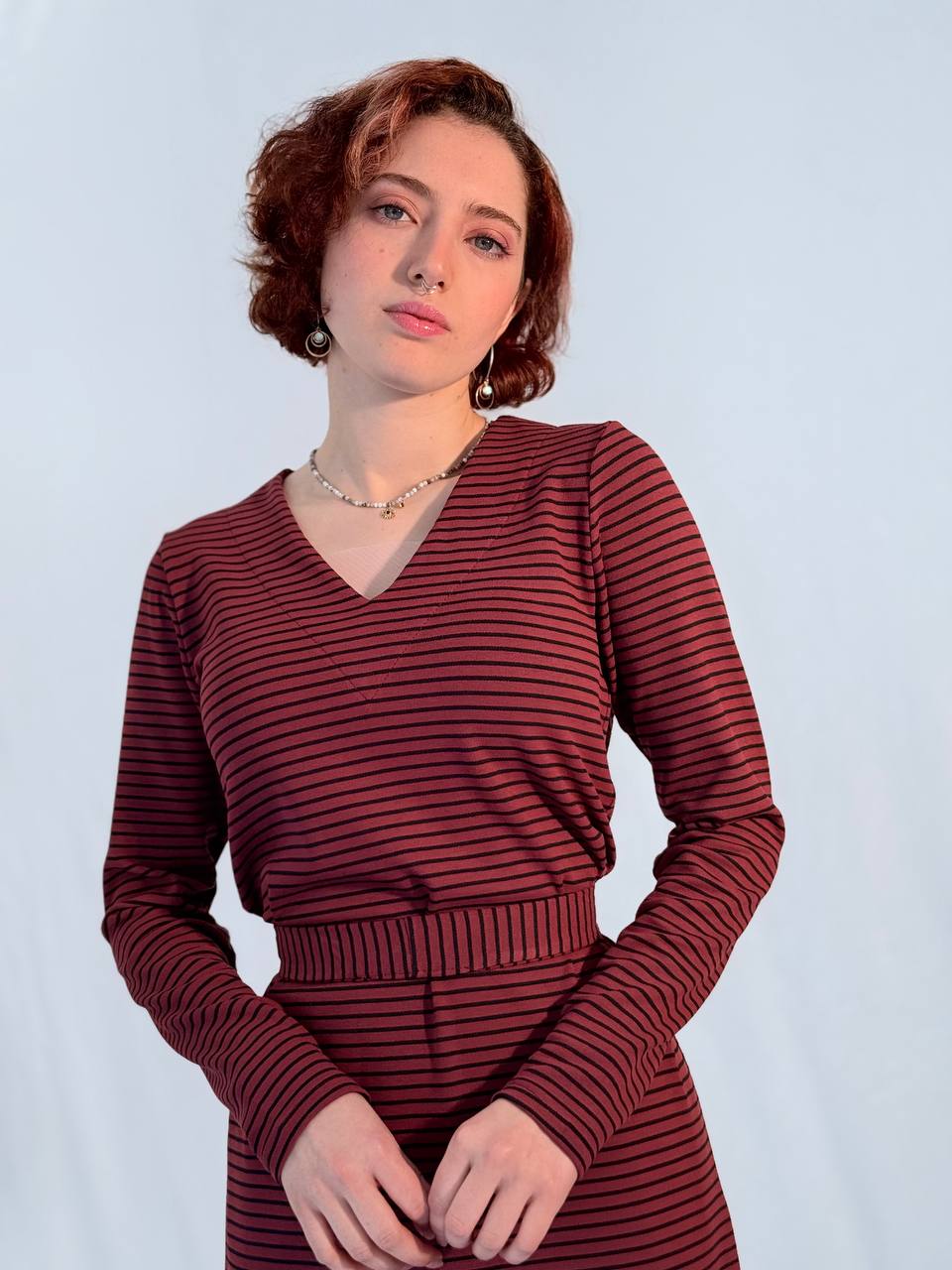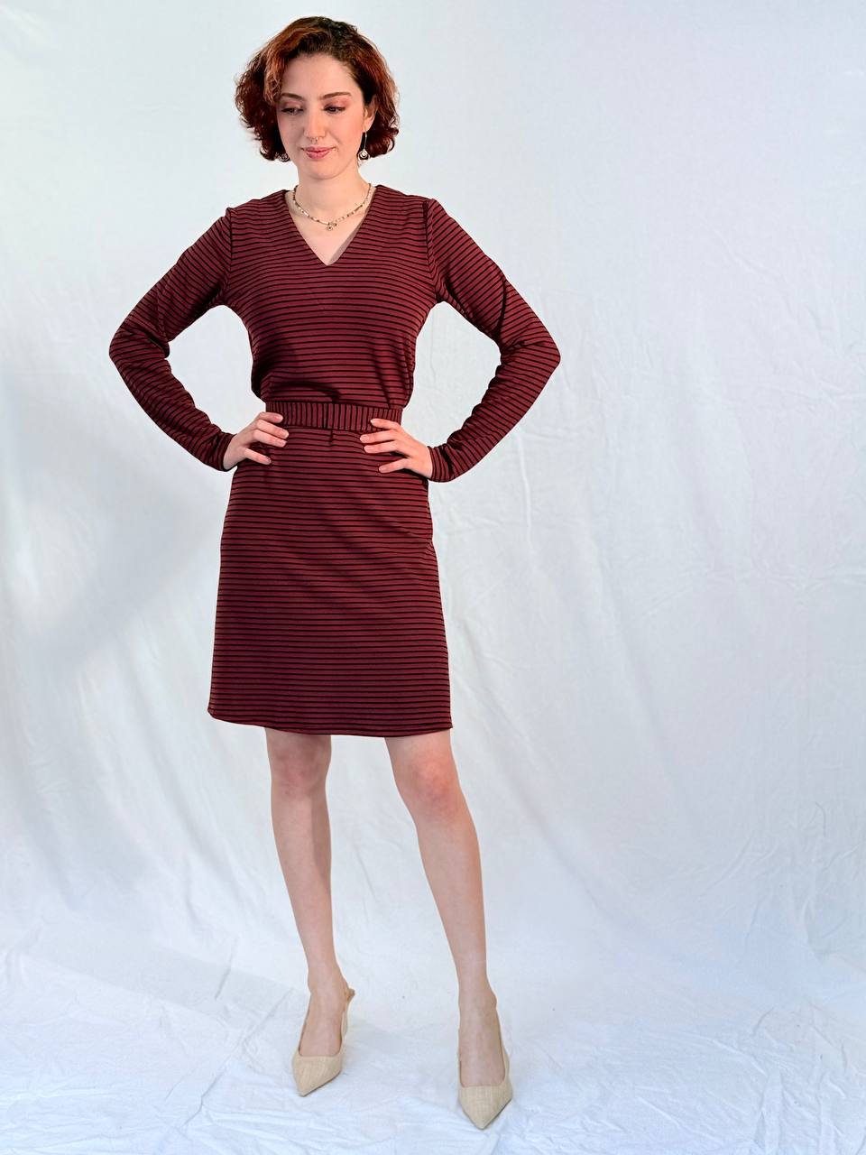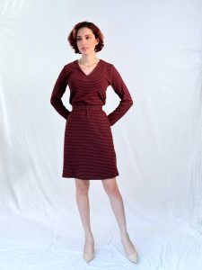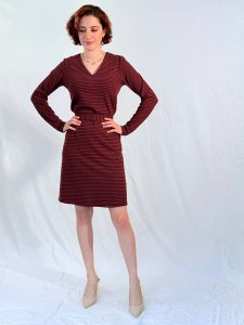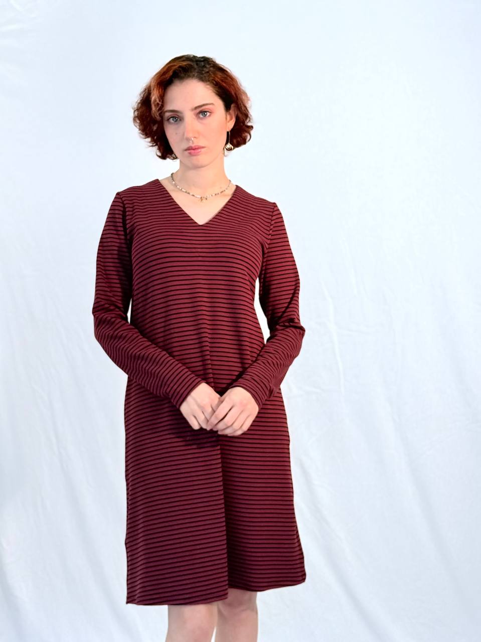 שמלת פסים מבד כותנה חורפי בגזרת A עם מפתח V רך ונשי.