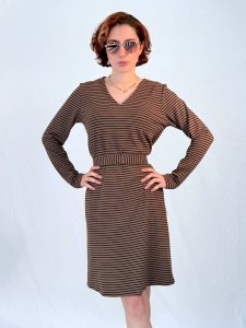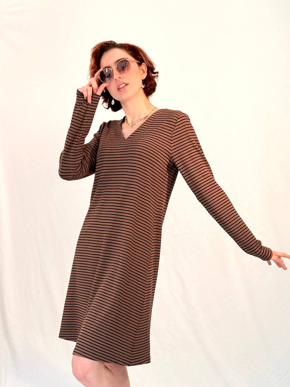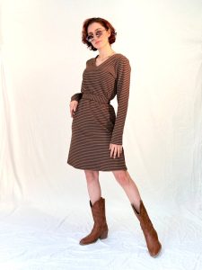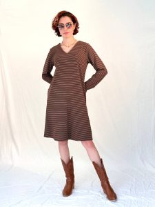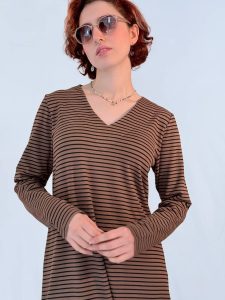 שמלת פסים מבד כותנה חורפי בגזרת A עם מפתח V רך ונשי.