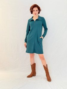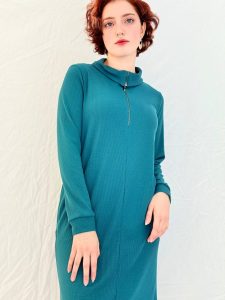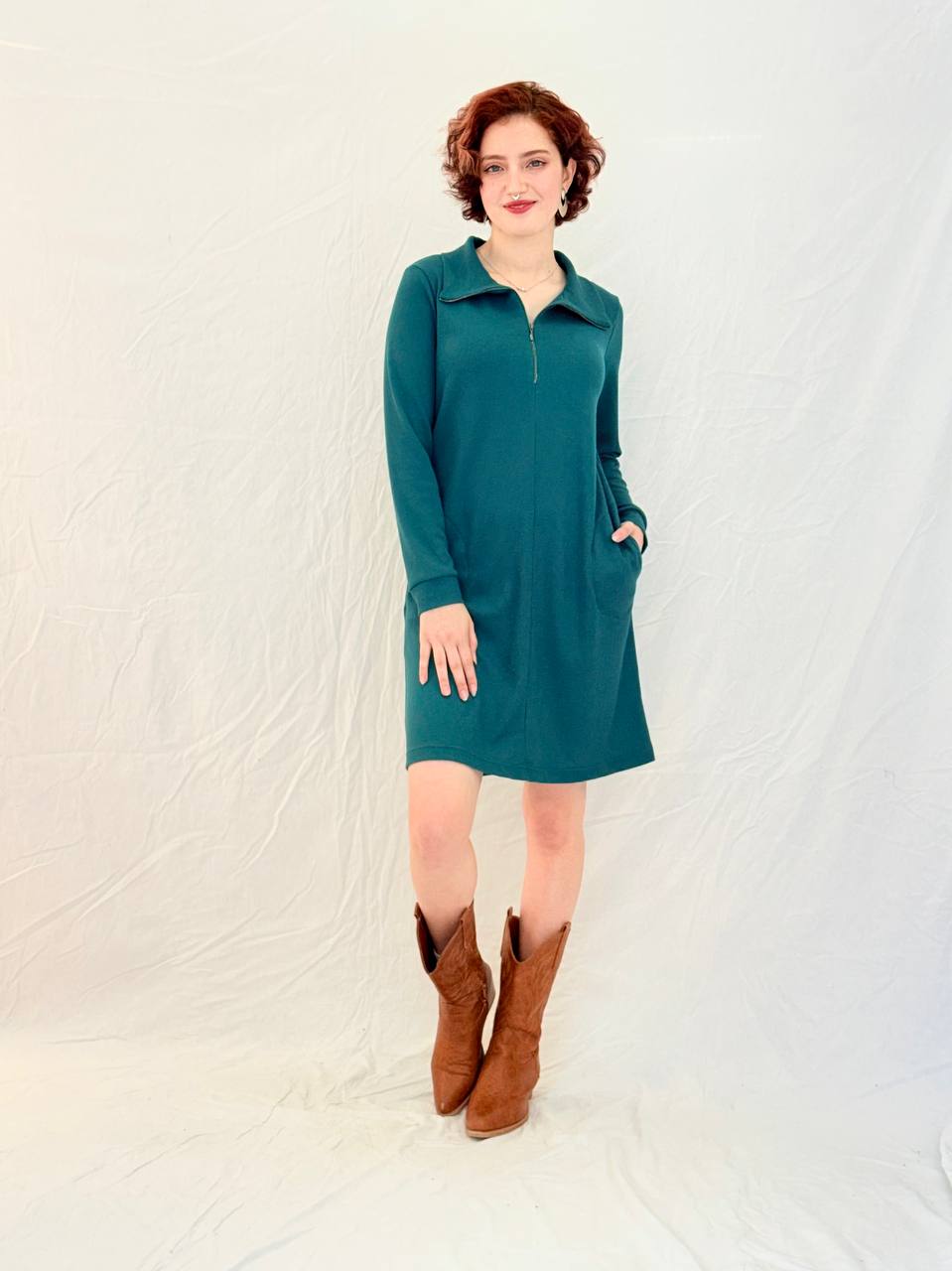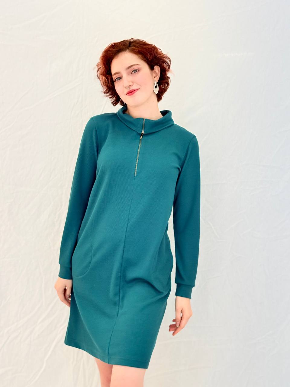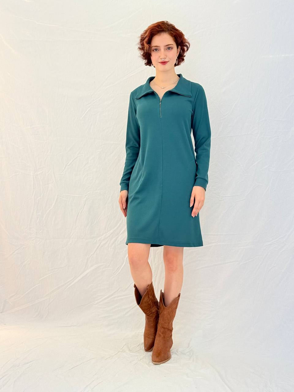 כיסים צדדיים נסתרים, שרוול ארוך ואורך ברך נקי. נוחה, מחמיאה, עוברת בקלות בין בוקר לערב.