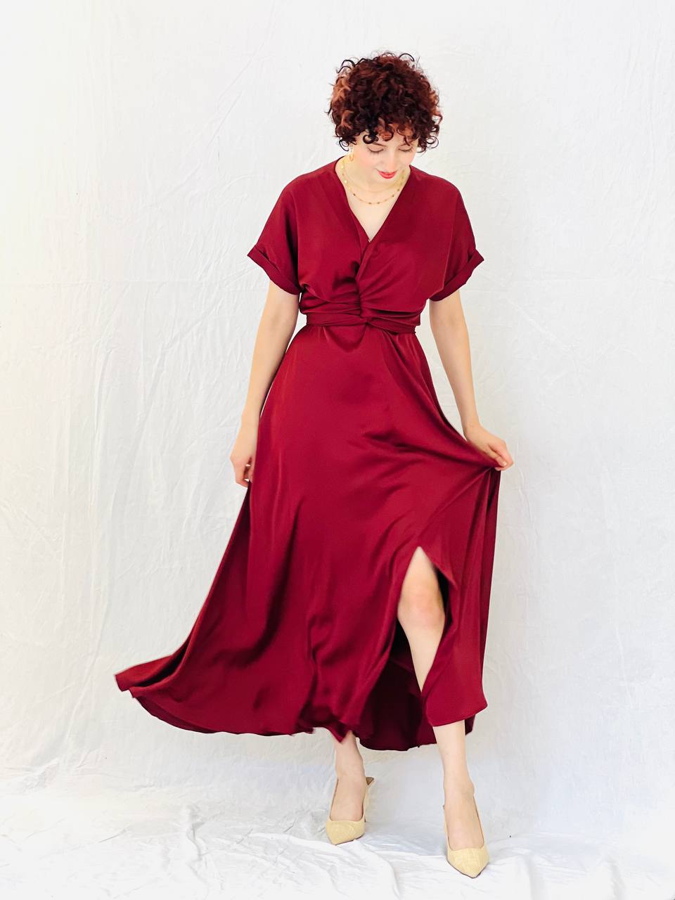 שמלת מריאן מעטפת חלק עליון עם חצאית עשירה ומתנפנפת.