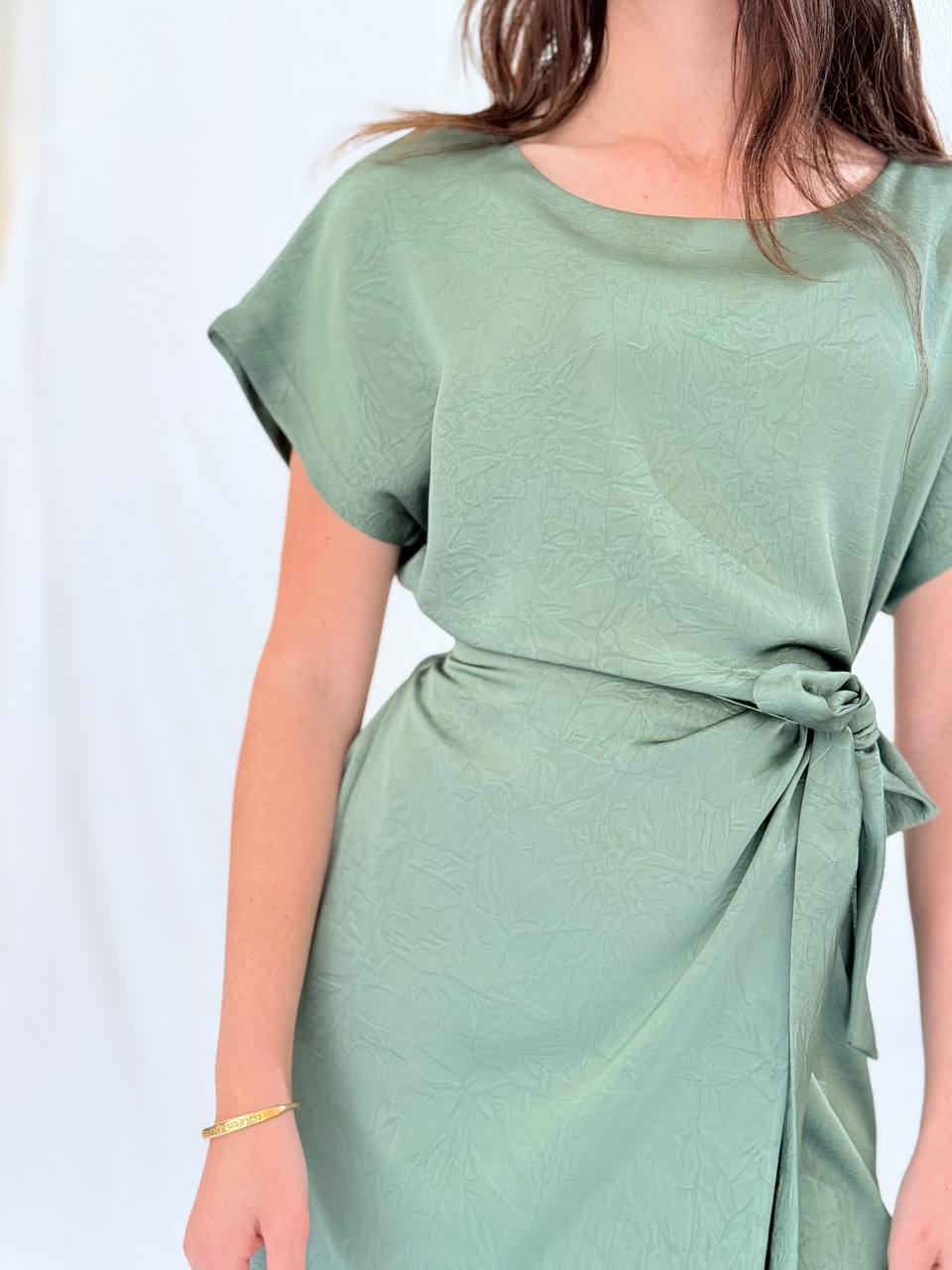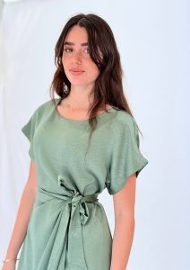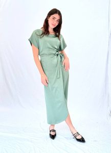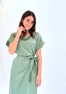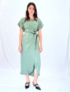 שמלת מידי מבד סאטן עם ברק עדין, גזרה מחמיאה וקשירה במותן למראה מעטפת נשי.