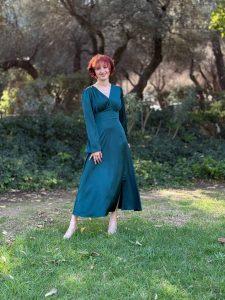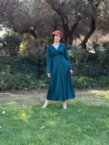 המותן מודגשת בעדינות, השרוול מתרחב בתנועה טבעית, והבד הנשפך מעניק תחושת קלילות.