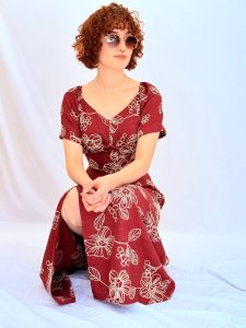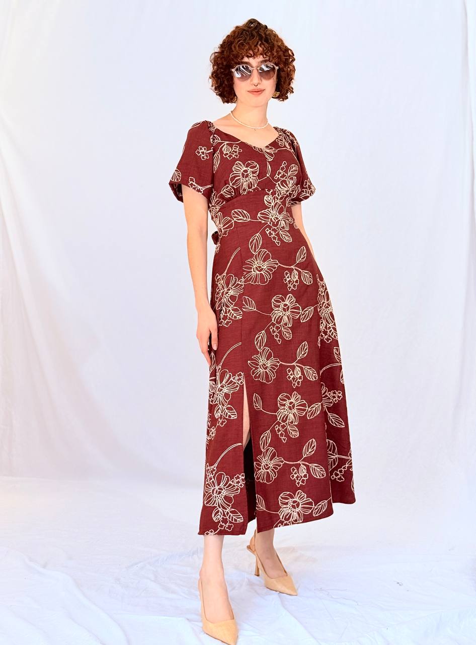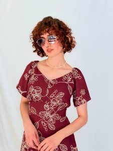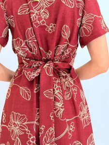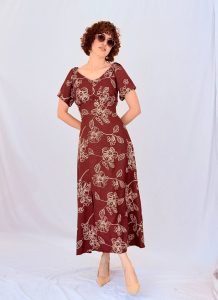 שמלת מקסי בגזרה רומנטית קלילה, עם הדפס עדין וקו מותן מודגש.