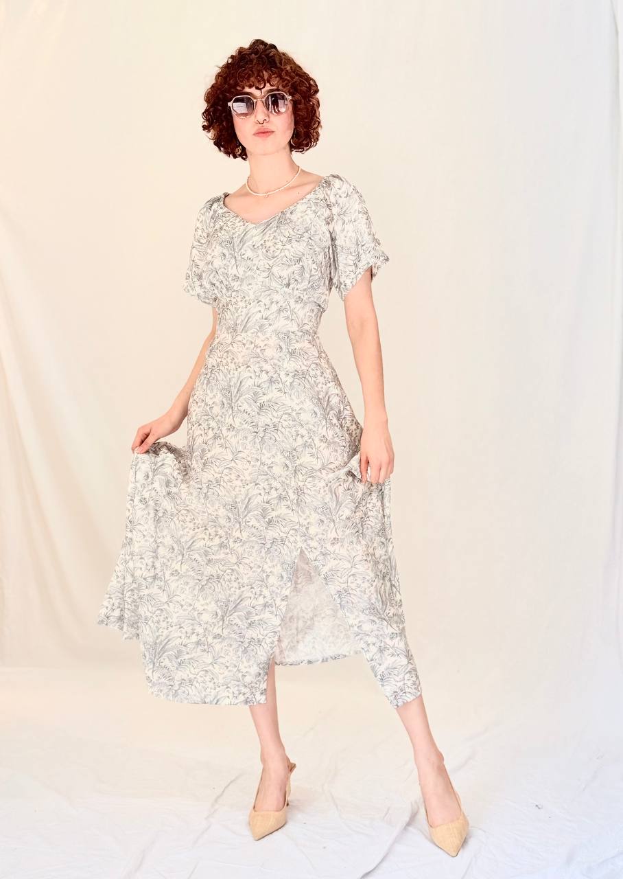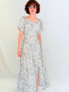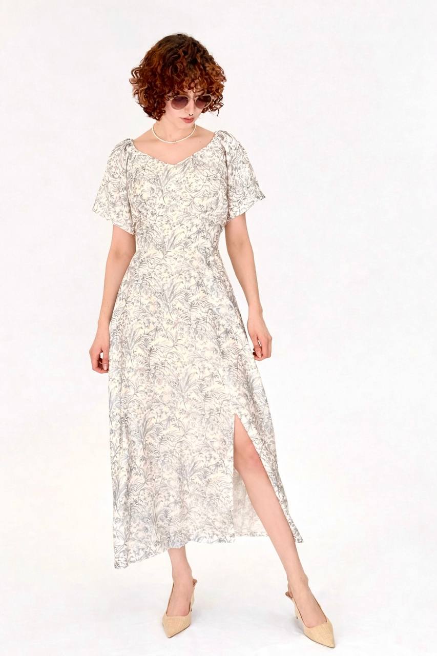 שמלת מקסי בגזרה רומנטית קלילה, עם הדפס עדין וקו מותן מודגש.
