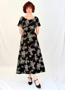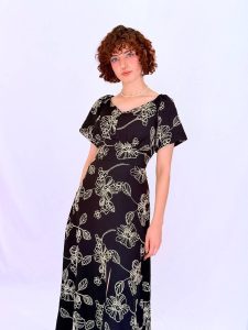 שמלת מקסי בגזרה רומנטית קלילה, עם הדפס עדין וקו מותן מודגש.