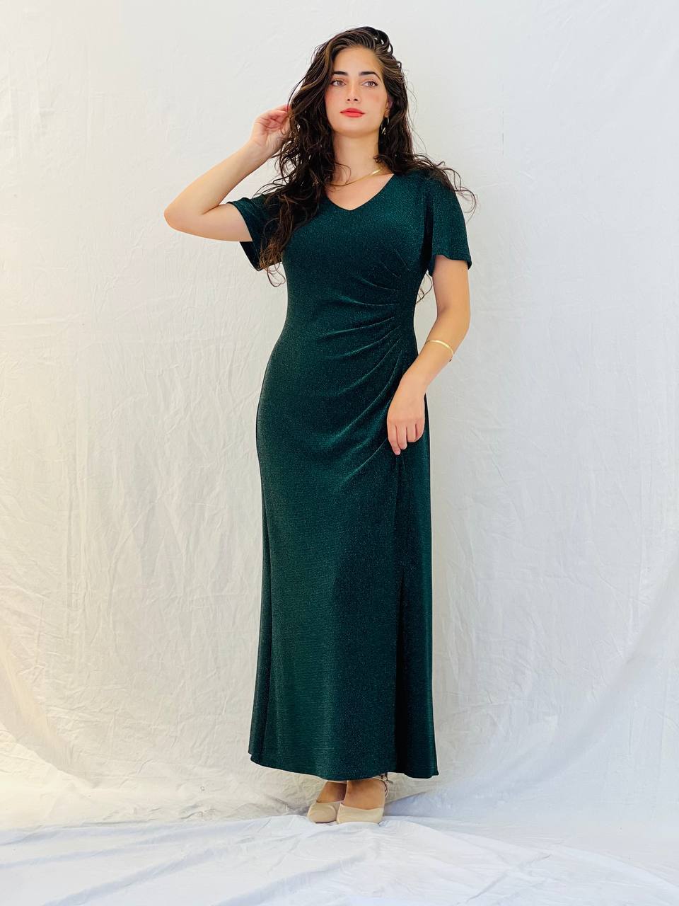 השמלה עשויה מבד מנצנץ וקליל שזז איתך, וכוללת שרוולים קצרים ומפתח וי עדין. השמלה מגיעה בגרסה מבריקה בגוון חלודה יוקרתי, בשחור ובירוק מושלם.