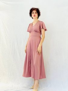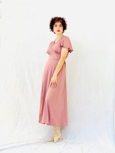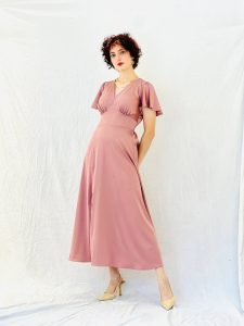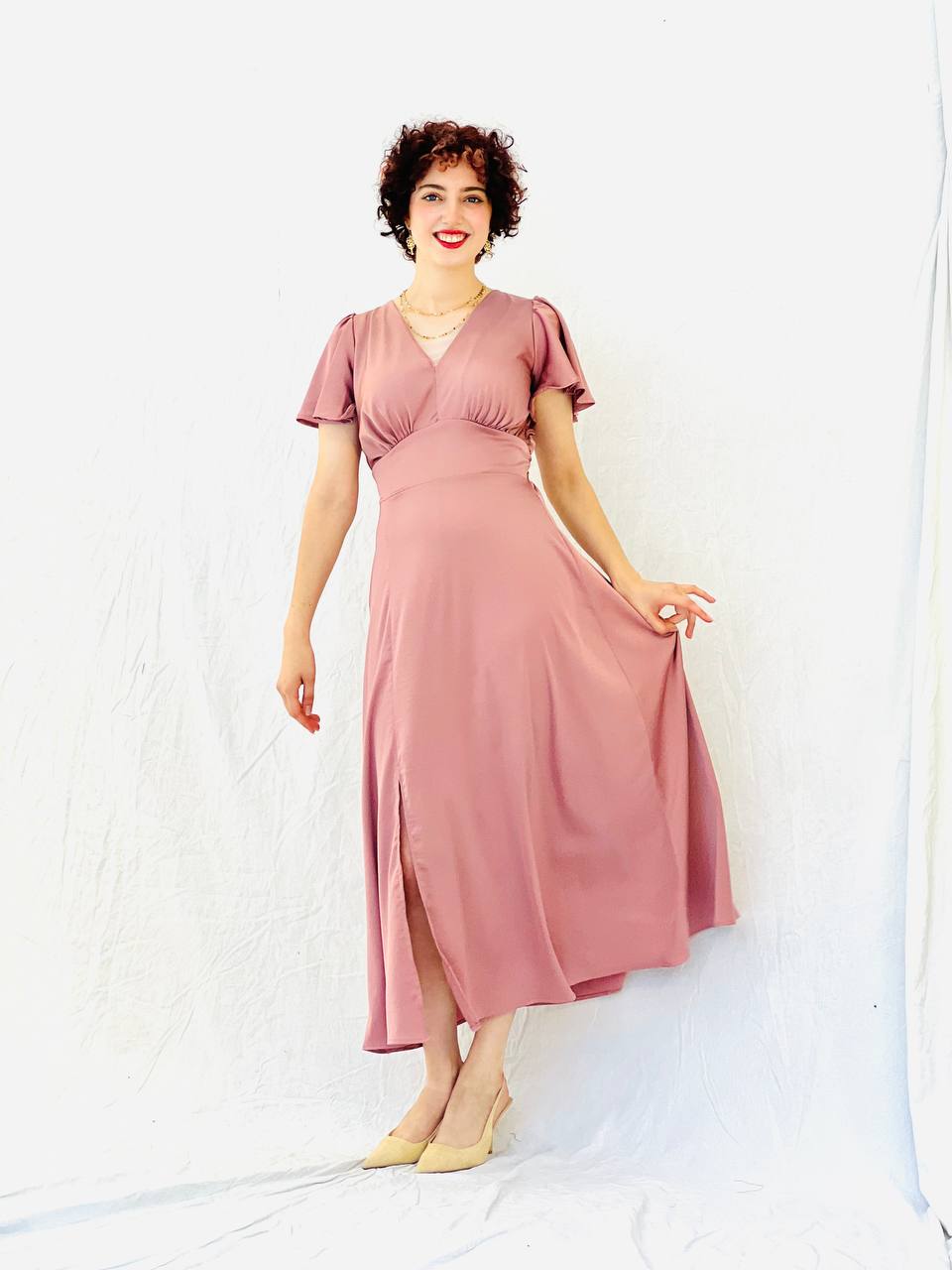 גזרת A מחמיאה עם חגורת מותן שמדגישה את הצללית, מחשוף וי עדין ושרוולים מתנפפים לתחושת תנועה ורכות.
