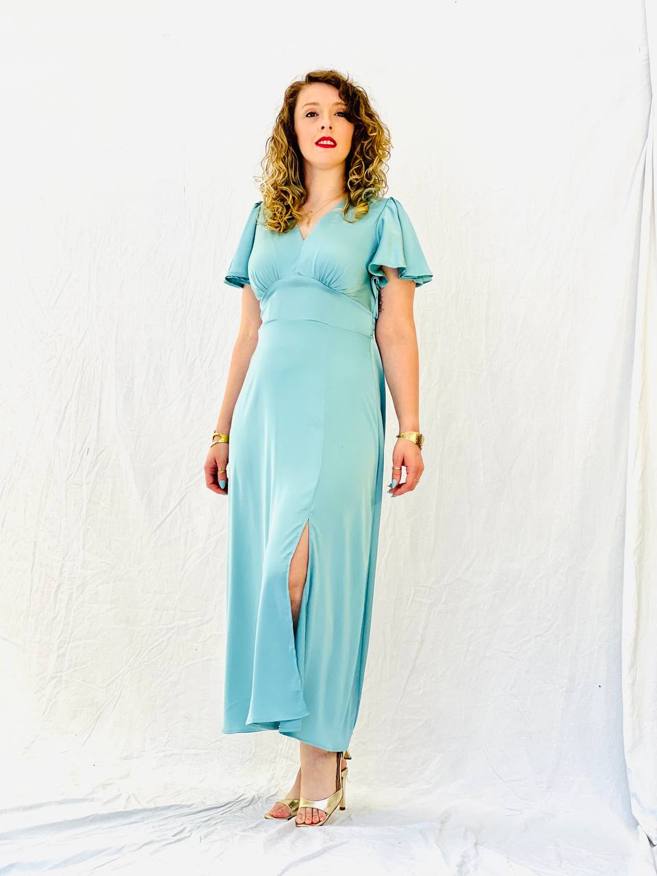 השמלה כוללת שסע קדמי שמשדר שיק לא מתאמץ.