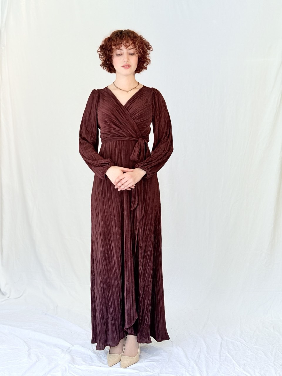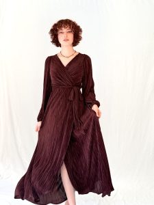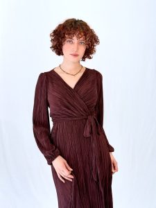 שמלה באורך מקסי בגזרת מעטפת מחמיאה עם חגורה לקשירה במותן, עשויה בד פליסה קליל ונעים שנופל ברכות על הגוף. שמלה מושלמת לאירועים – משלבת מראה מרשים עם נוחות מקסימלית.